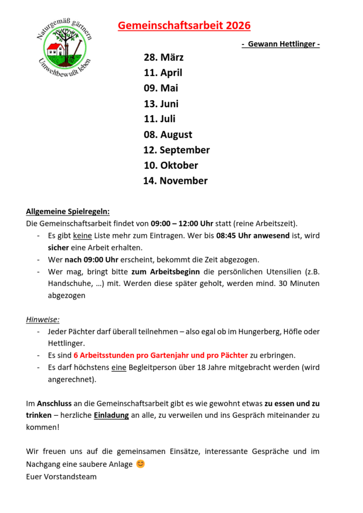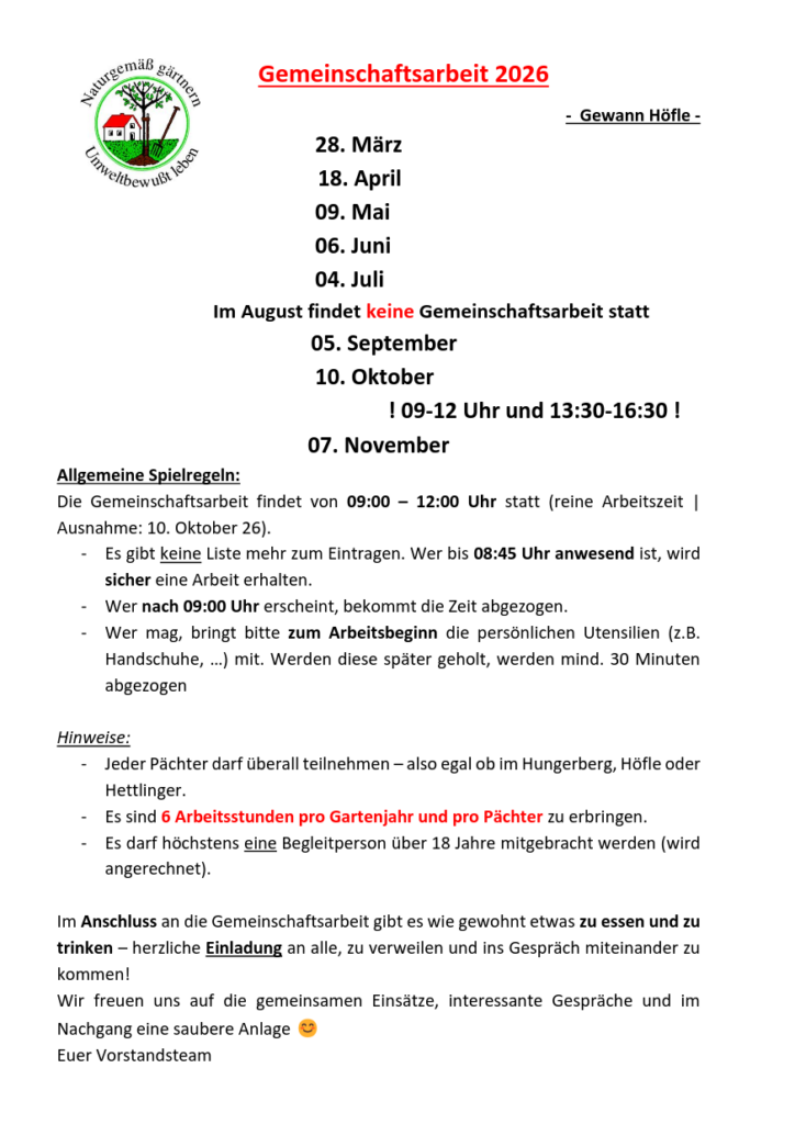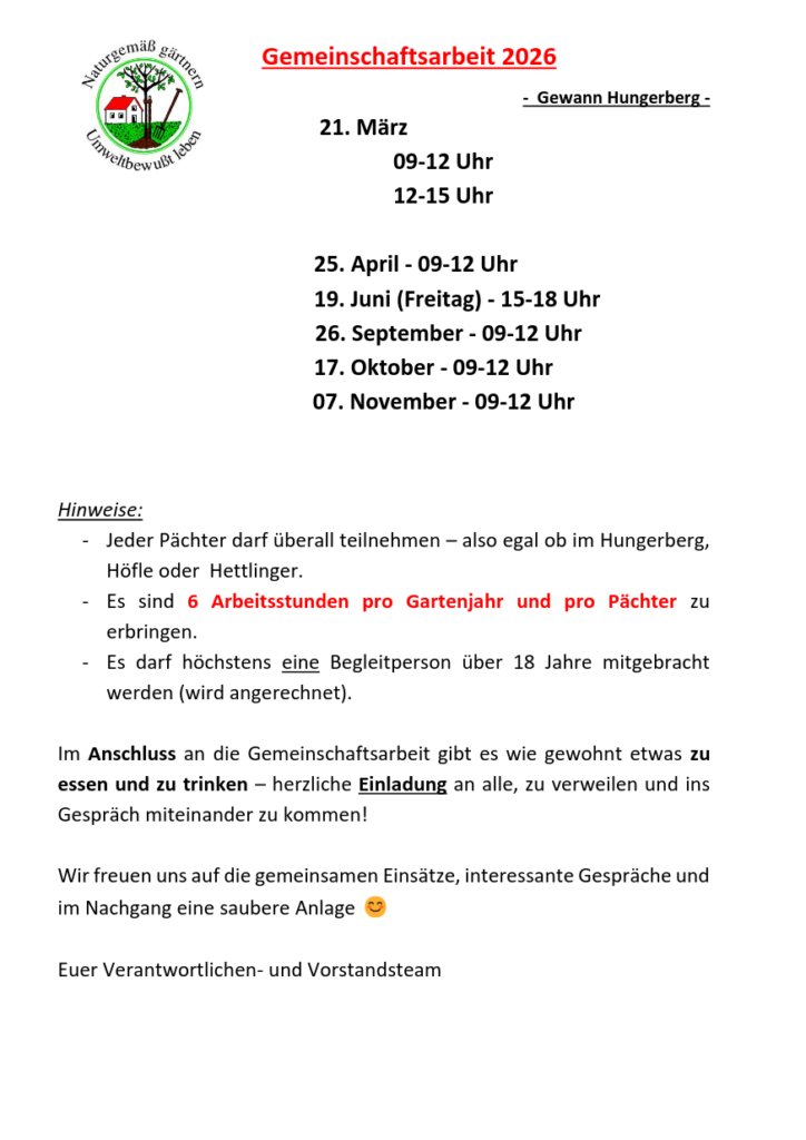 Bitte beachtet, dass ab diesem Jahr sechs Stunden Gemeinschaftsarbeit je Pächter zu erbringen sind, je Termin drei Stunden von 9:00 bis 12:00 Uhr.